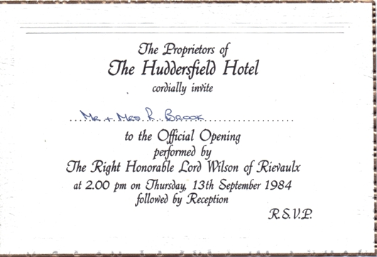 In the early 80's, a friend and good neighbour of ours Mr Roy Brook owned Darwents French Polishers in Kirkgate. As Mr Brook is ready for retiring, Johnny and Joe purchased the building as it was part of their island complex. Although at the time at the time they didnt know what to do with it. After consulting our architect, accountant and the Yorkshire Tourist Board the brothers decided to convert the building into a hotel (The Huddersfield Hotel). The hotel was officially opened in September 1984 by Harold Wilson the ex prime minister. Mr and Mrs Brook were invited and a copy of their invite above.